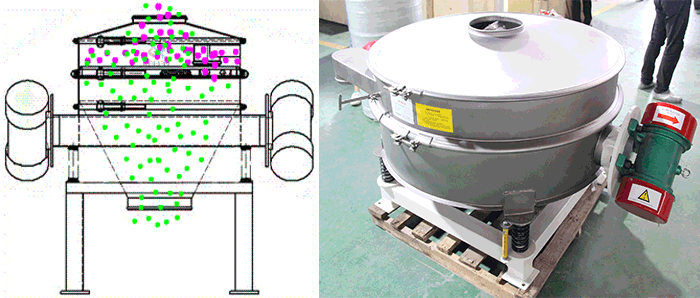 旋振篩,由單臺(tái)立式振動(dòng)電機(jī)作激振源,電機(jī)上、下兩端安裝有偏心重錘,將電機(jī)的旋轉(zhuǎn)運(yùn)動(dòng)轉(zhuǎn)變?yōu)樗健⒋怪?、傾斜的三次元運(yùn)動(dòng),再把這個(gè)運(yùn)動(dòng)傳遞給篩面,使物料在篩面上做外擴(kuò)漸開線運(yùn)動(dòng),故該系列振動(dòng)篩稱之為旋振動(dòng)篩。