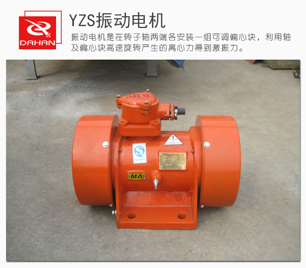 YZS振動電機是動力源與振動源結(jié)合為一體的激振源,振動電機是在轉(zhuǎn)子軸兩端各安裝一組可調(diào)偏心塊,利用軸及偏心塊高速旋轉(zhuǎn)產(chǎn)生的離心力得到激振力。