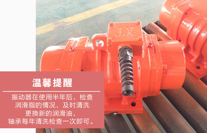 4、大漢機(jī)械溫馨提醒:振動器在使用半年后,檢查潤滑脂的情況,如發(fā)現(xiàn)變干或者有硬塊時,及時清洗更換新的潤滑油,軸承每年清洗檢查一次即可。