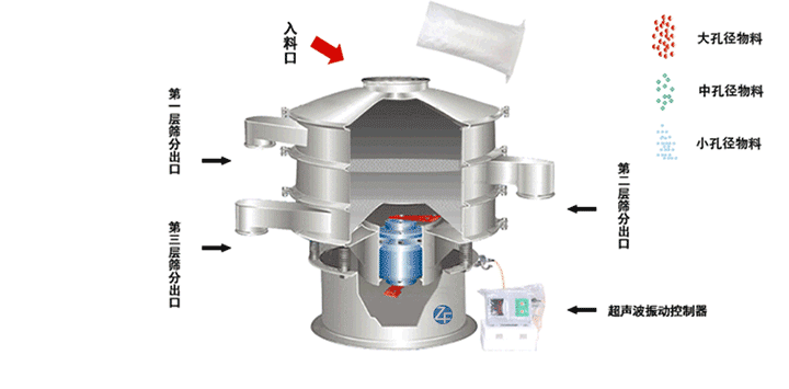 超聲波振蕩篩采用超聲波換能器清網裝置,改變了單一頻率,解決強吸附性,易團聚,高靜電,高精細,高密度,輕比重等篩分難題,篩分精度可提高1-99%,產量可提高1-10倍,滿足了500目以上工業(yè)化生產需要。