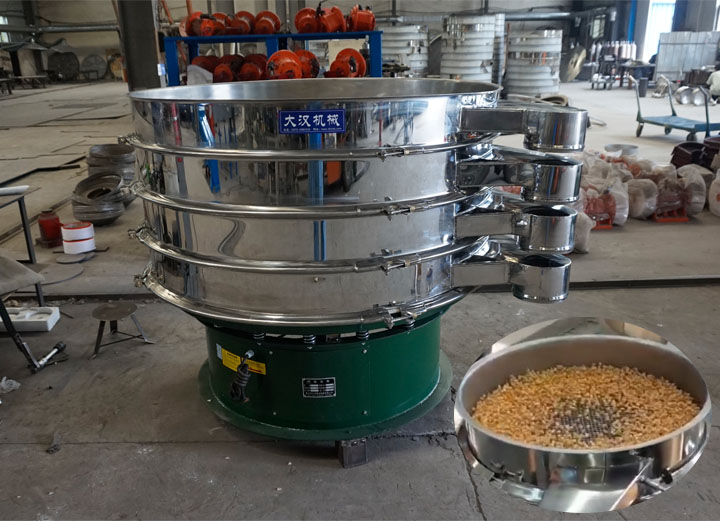 將速凍玉米倒入篩機(jī)中,在振動(dòng)電機(jī)的作用下,速凍玉米在篩面上由中間向四周擴(kuò)散,期間,速凍玉米根據(jù)粒度通過篩網(wǎng),大于篩網(wǎng)尺寸的速凍玉米將停留在篩面上并從出料口排出,小于篩孔的速凍玉米將進(jìn)入下層篩網(wǎng)繼續(xù)篩分,直至被排出。